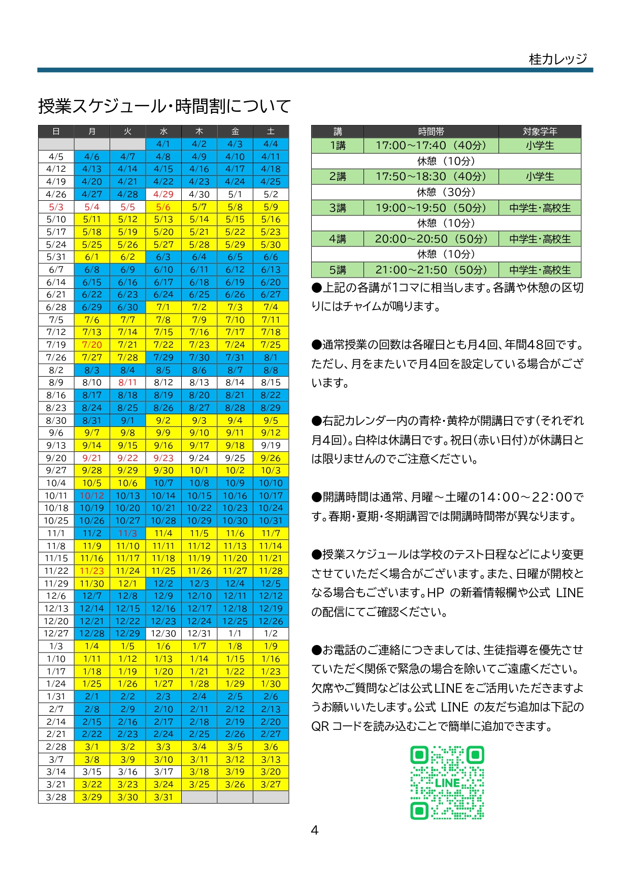 ホーム 2023.05.302026.03.18 桂カレッジの新着情報 3/16(月)・17(火)は休講日です 2026.03.11 休講情報 2026年 春期講習のお知らせ 2026.03.04 講習案内 3月のニュースレター 2026.03.01 未分類 23日(月・祝)は開講日です 2026.02.20 開講状況 2026年4月より新体制スタート その⑧ 講習・料金について 2026.02.18 新体制紹介 過去のお知らせはこちら 桂カレッジをより詳しく ホームhomeパンフレットonline lesson10個の特長features桂カレッジの基本情報basics所属生(卒塾生含む)students教室所在地・アクセスmap入会までの流れflow受講料feesよくあるご質問questionsお問い合わせinquiry合格実績results合格体験記experiences お問い合わせ 電話で問い合わせる 075-394-0202までお電話ください 17時以降は生徒指導のため対応できない場合がございますのでご了承ください Webで問い合わせる 専用フォームから送信してください 折り返し担当者からメールにてお返事を差し上げます 桂カレッジの公式LINE 桂カレッジでは保護者様・生徒さんとの連絡に公式LINEを活用しています。上のバナーをクリックすると、パソコンならQRコードが表示されます。スマホならLINEが起動しますので、ぜひ友だち登録してくださいね。 2026年度 募集状況 現在準備中です 新小4新小5新小6新中1新中2新中3新高1新高2新高3クラス指導ーーー1対2個別指導 1年間の授業カレンダー おかげさまで多くの保護者様・生徒さんに支持していただき、現在追加の講師募集中です。詳細は以下のサイトをご覧ください。