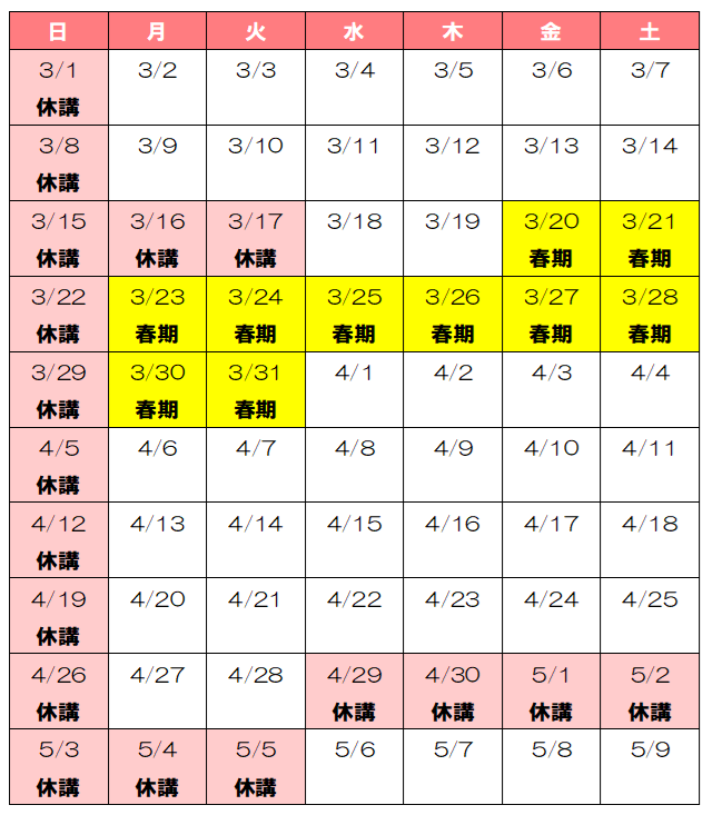 - 3/16(月)~17(火)、4/29(水・祝)~5/5(火・祝)は調整休講日です