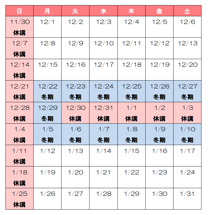 - 12/22(月)~1/10(土)は冬期講習期間です。